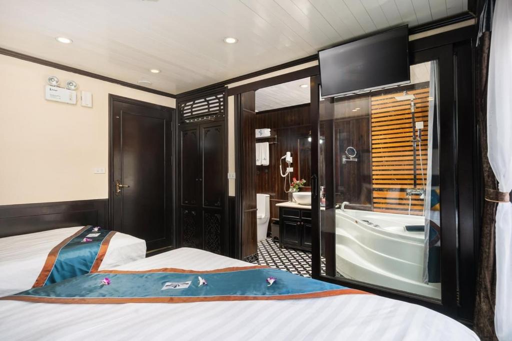 12h15 : Après avoir participé à la croisière Halong Aquamarine, vous serez enregistré. Tout en dégustant un verre de bienvenue, le Cruise Manager vous présentera l'itinéraire et les consignes de sécurité.