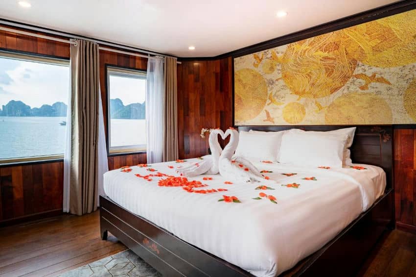 13h00 : Déjeuner buffet tout en profitant des vues imprenables alors que le bateau navigue vers le sud-est de la baie d'Halong, en passant par les célèbres îlots